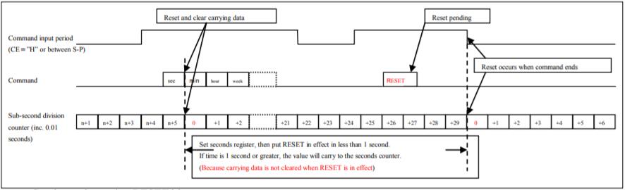 当RESET位变为’1’时,单独不会导致计数器停止(它将继续计数).RESET操作独立于其他命令发生.如果数据写入RESET位,则当命令输入周期结束时,子秒计数器将复位.在这方面,设置秒寄存器,然后在小于1秒内复位亚秒计数器,因为当RESET位有效时,不会清除携带数据.