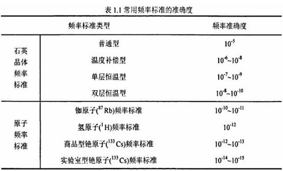 频率标准的发展对于一个国家的经济、科学与技术、国防和社会安全有着非常重要的意义。由于制造、交通运输、通讯与信息技术的不断迅猛发展,对时间和频率测量的准确度和精确度要求也越来越高。导航、定位、大地测量、天文观测、网络授时和同步以及电网故障检测中都需要高稳定度和准确度的频率标准。按照频率标准的性能指标和应用领域来划分,可以将其分为一级频率标准(铯原子频标)二级频率标准(包括铷原子频标和高稳石英晶体振荡器)和其它频率标准(包括除高稳石英晶体振荡器以外的其他晶体振荡器)。表11列出了常用频率标准的准确度.