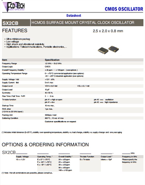 | SX2CB15F50E100MHz | FCD-Tech晶振 | 100 MHZ | 50ppm | 3.3V | 15pF | -20℃至+70℃ | 2.5 x 2.0mm |